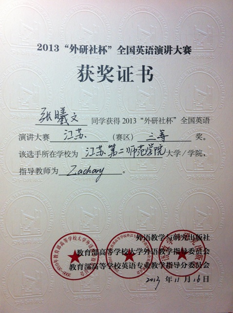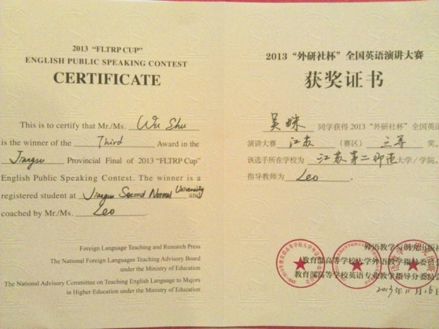 2013“外研社杯”全国英语演讲大赛已落下帷幕,我院张曦文、吴姝喜获江苏赛区三等奖。