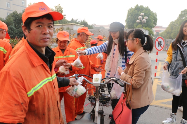 现代传媒学院组织给环卫工人送爱心早餐活动