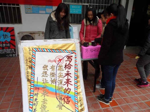 本次活动由社会发展学院学生会心理协会组织策划,为了使活动能够达到预期的效果,活动前期,学生不仅通过海报等形式在校园内积极宣传,还自制了信箱。活动当天,该系同学们的参与热情高涨,其他几个院系的同学们也来积极参加。活动结束后,社发院心理协会收回了所有信件并封存好,统一保管,未来将按时寄送到同学们手中。