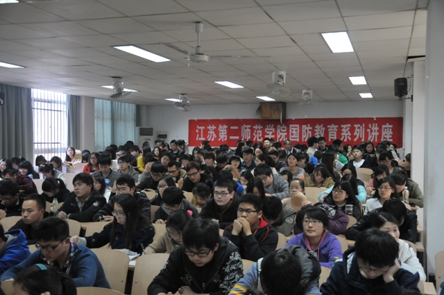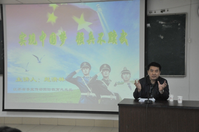 3月26日下午,江苏省委宣传部国防教育处处长赵清林应邀来我院,在草场门校区教学楼②101教室作了题为《实现中国梦,强兵不黩武》的讲座,该讲座是我院“石城讲坛”文化素质课之国防教育系列活动之一,此次活动由教务处、学工处(人武部)、团委联合举办,人武部部长、学工处处长刘莹主持。