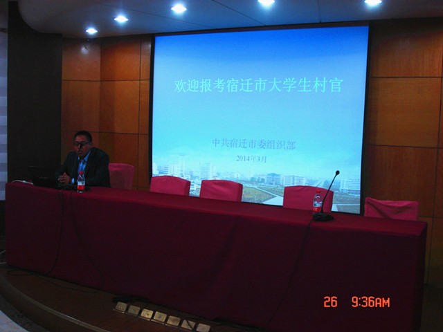 为贯彻落实党中央《关于引导和鼓励高校毕业生面向基层就业的意见》和江苏省委、省政府《关于加快实施“一村一社区一名大学生”工程的意见》精神, 3月26日上午,在草场门校区现代教育技术楼1楼报告厅,院招就处就业办与宿迁市宿豫区人社局联合举办了“2014年宿迁市大学生村官选聘政策宣讲会”。