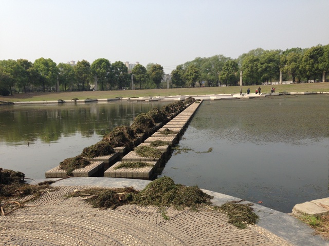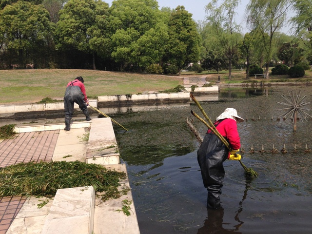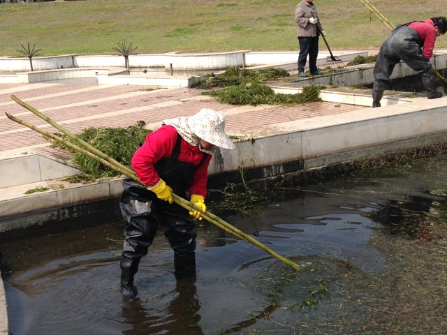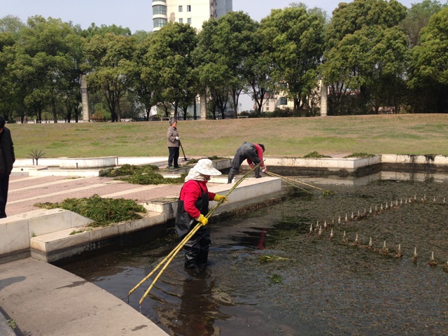 清明假期,校园里一下安静了许多。就在大家都外出踏青、轻松度假的时候,校园里却活跃着一群忙碌的身影。4月5日上午,浦口校区小西湖里,一群校工正辛苦地清理水草、维护河塘。