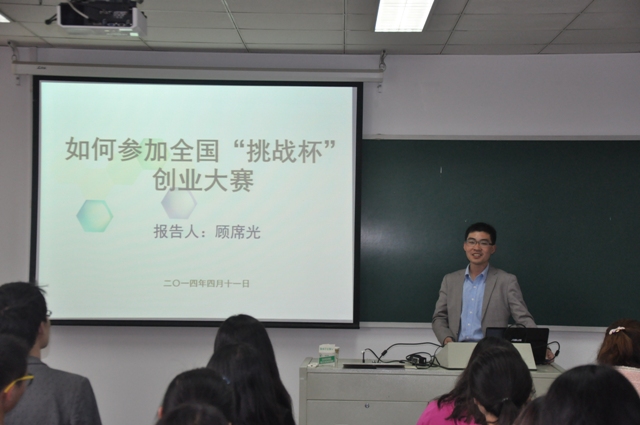 顾席光博士运用多媒体,图文并茂地给大家详细介绍了参加全国“挑战杯”创业大赛的相关情况,层次分明地讲解了“挑战杯”创业计划书的写作要求,并阐述了创业项目的要求以及创意来源途径。顾席光博士还和大家进行了积极互动,现场气氛热烈。