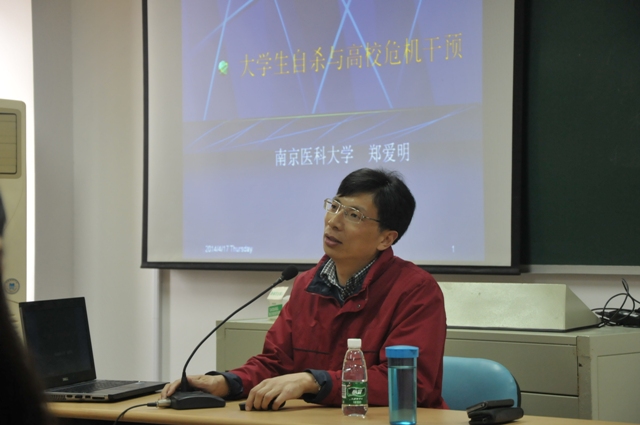 针对春季心理问题、精神疾病高发的现状,4月17日下午,学工处邀请江苏省心理健康教育研究中心江宁基地负责人、南京医科大学心理健康教育与研究中心主任郑爱明教授来我院,为全体辅导员作了一场“大学生自杀与高校危机干预”的专题讲座。