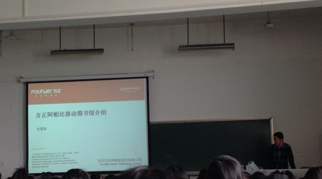 为满足大学生移动阅读的需要,提高图书馆资源利用率,5月14日下午,图书馆在浦口校区教学楼326教室举办主题为“移动图书馆与知识发现系统”的专题知识讲座。来自北京方正阿帕比有限公司的工程师朱恩泉向大家详细介绍了“移动图书馆”的功能和使用方法。
