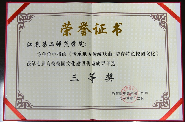 在教育部公布的第七届全国高校校园文化建设优秀成果获奖名单中,我院申报的校园文化建设成果《传承地方传统戏曲 培育特色校园文化》荣获优秀成果三等奖,这也是我院首次获此殊荣。