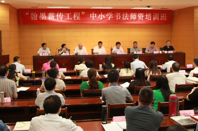 炎炎七月,金陵伏暑;二师院内,翰墨飘香。7月16日上午,“翰墨薪传工程”江苏省中小学书法师资培训班在我院举行开班仪式。省教育厅副厅长、我院院长丁晓昌,我院常务副院长、省教师培训中心主任周成平,中国书法家协会副主席、省文联副主席言恭达,中国书法家协会副秘书长张陆一,省文联副主席、省书协主席孙晓云等出席。