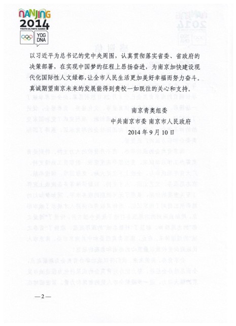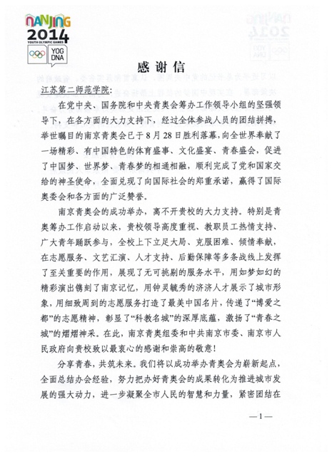 9月10日,南京青奥组委、中共南京市委、南京市人民政府向我院发来感谢信,对我院在青奥会筹办以来给予的大力支持表示感谢,并对我院志愿服务工作给予了充分肯定!