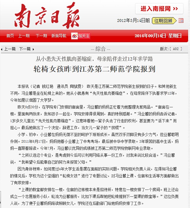 南报网讯(记者 钱红艳 通讯员 陶赋文)今天是江苏第二师范学院新生报到的日子。和其他报道的新生不同,女孩冯业馨是坐在轮椅上报到的。冯业馨从小患“先天性肌肉萎缩症”,在母亲陪伴下执着求学12年,今年7月20日被江苏第二师范学院物联网专业正式录取。