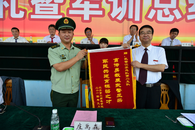 庄禹森宣读了军训表彰决定。院领导为军训先进连排、内务标兵寝室、“军歌嘹亮”大合唱比赛获奖者、军训先进个人、优秀带队教师颁发了奖状。丁晓昌代表我院向承担施训任务的武警江苏总队第二支队赠送了锦旗。