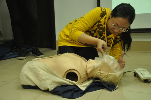 此次活动进行了心肺复苏、初级救护理论知识两门课程的培训。在培训过程中,指导老师为大家仔细讲解并演示了如何在抢救的黄金时间给伤患者进行止血、包扎、心肺复苏、人工呼吸等,同学纷纷亲身体验,积极实践,并很快掌握了救护要领。