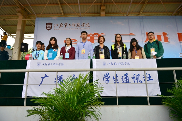 在这场别开生面的雨中运动会中,学通社、广播台的同学们紧张而有序地工作着。他们一个用文字,一个用声音,生动地记录着本次运动会的激情与感动。瑟瑟秋风动摇不了他们坚定的意志,冰冷的雨水浇不灭他们如火的热情。不少小记者和播音员刚刚表演完,便即刻加入采访和播音的行列中去。为了更加及时、全面、立体地报道本次运动会,学通社和广播台联手打造了“江苏第二师范学院官微”,用微博简洁的语言,配以精选的新闻照片和视频,让更多同学能足不出户、及时地了解运动会赛况。短短5个小时,江苏第二师范学院官微的运动会专题阅读量就达2.6万人次。