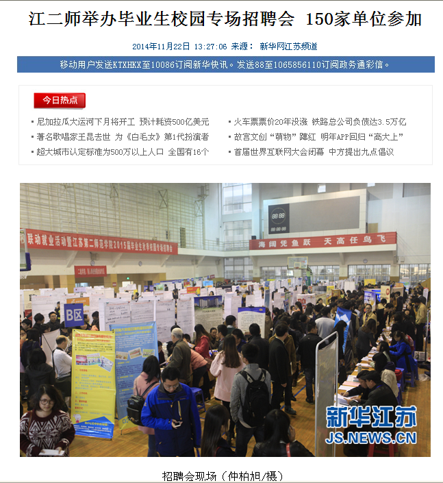 在常规招聘会的基础上,今年校园招聘会增加了两大亮点。一是“多方合作,共搭平台”,本次招聘会由江苏第二师范学院、省人才、省招就中心和省职介中心四方合作举办,为学生提供更多就业平台的工作岗位。二是“线上线下结合”,增设了网络招聘峰会,有50余家用人单位在网上发布招聘职位,学生可登录网站进行简历投递,双方能够充分对接,最大限度覆盖高校毕业生群体,真正实现了企业和人才双向选择。