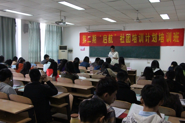 “启航”社团培训计划是我院团委制定的针对学生社团建设的培训课程,旨在进一步加强和规范我院学生社团的管理,提高学生干部的综合素质。目前已开展二期培训,全院近400名社团积极分子参加培训。
