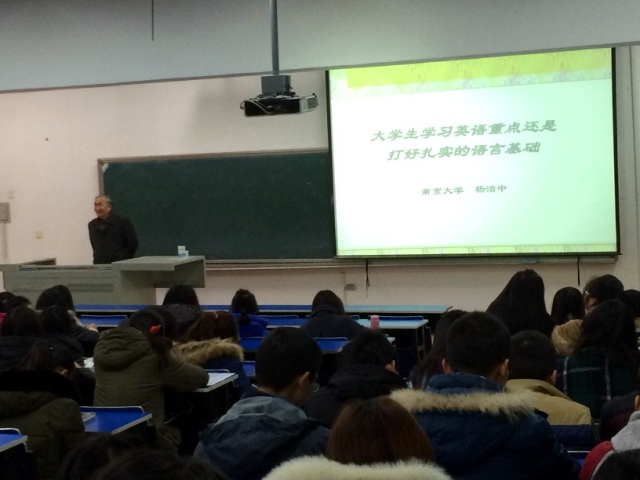 12月3日下午,该院邀请全国大学英语指导委员会会长、南京大学资深教授杨中治先生作了“如何学好英语”的专题讲座。讲座由顾楠老师主持。杨老师从英语是什么、我们为什么要学习英语以及怎么样学好英语三个方面作了详细讲述。2014级六个班级的同学们聚精会神,认真聆听。杨教授的谆谆教诲令同学们受益匪浅。