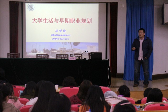 12月17日晚,生化学院在草场门校区现教楼二楼报告厅举行“治学 择业 修身”学风建设系列讲座第二场,校友林爱俊应邀主讲“大学生活与早期职业规划”,党总支书记郭琦出席。
