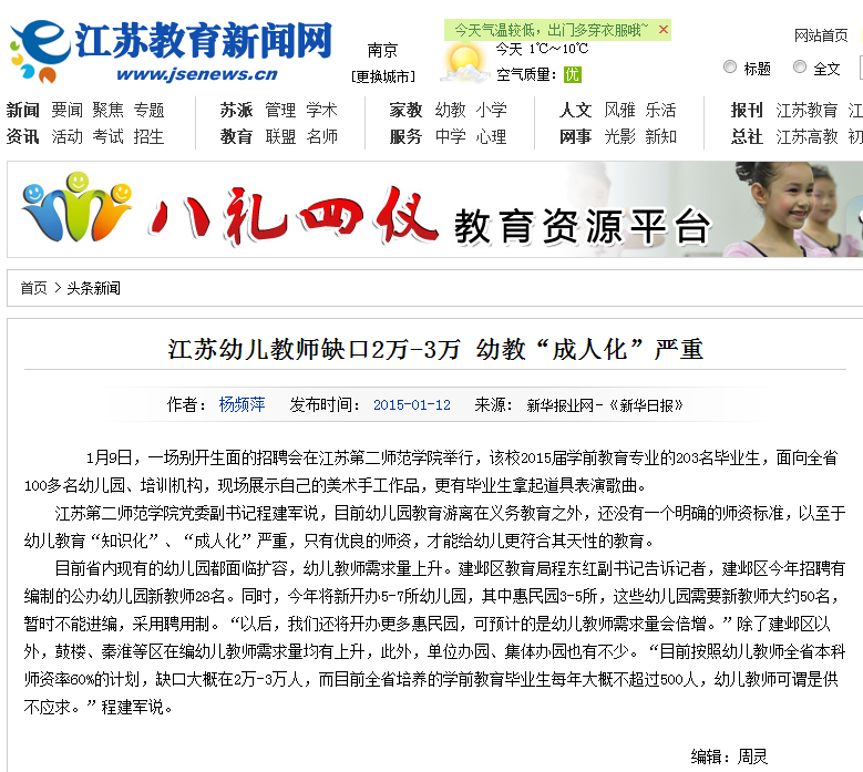 江苏幼儿教师缺口2万-3万 幼教“成人化”严重