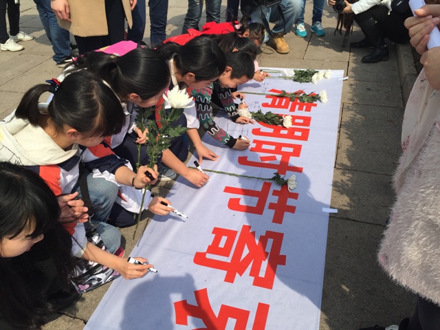 志愿者们带领孩子们回顾历史,缅怀先烈,在纪念旗上签名,集体默哀,向墓碑敬献鲜花。