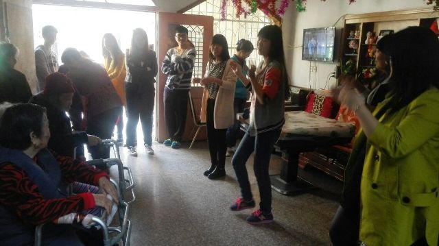 在敬老院里,大家帮老人打扫卫生,陪老人聊天,给老人表演小节目,受到了老人的欢迎。