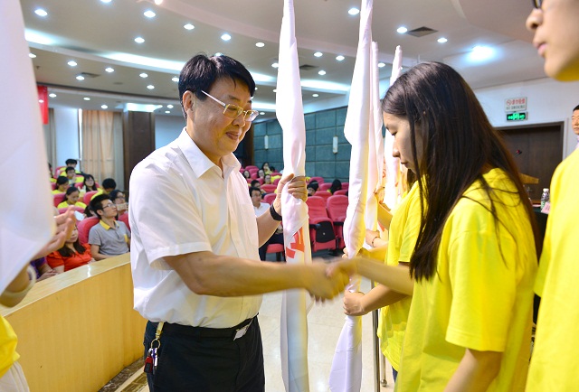 外国语学院分团委书记王倩、文学院学学生孔静分别代表带队教师和学生发言。与会领导在热烈的掌声中为各实践团队授旗,并合影留念。