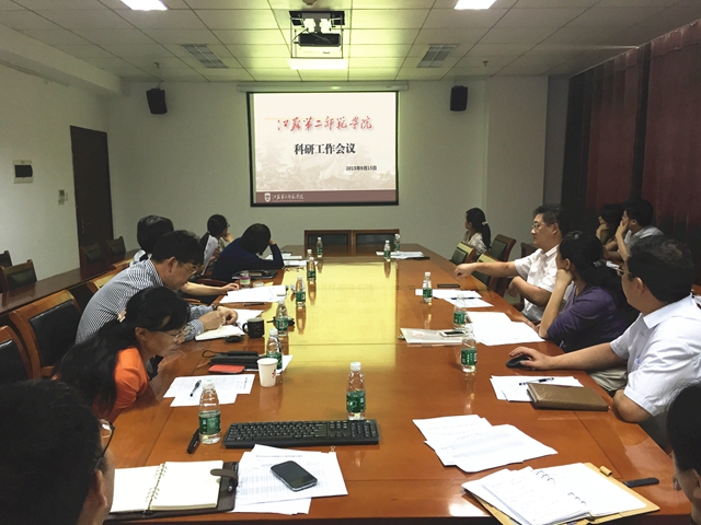 科研处项目科科长王瑾通报了2015年上半年各院部项目申报情况。文学院副院长冯保善、数学与信息技术学院院长徐新萍分别介绍了该院科研组织工作经验。冯保善就“由满足基本教学需要到提升内涵彰显特色的学科建设”这一议题,在广泛搜集省内高校同类学科建设经验的基础上,提出了凝练学科发展方向、强化学科队伍建设、加强学科基地和基础平台建设几大举措。徐新萍则重点强调青年骨干教师队伍是科研工作的重要力量,她分享了数信院在科研组织工作中对青年教师的鼓励与扶持措施。