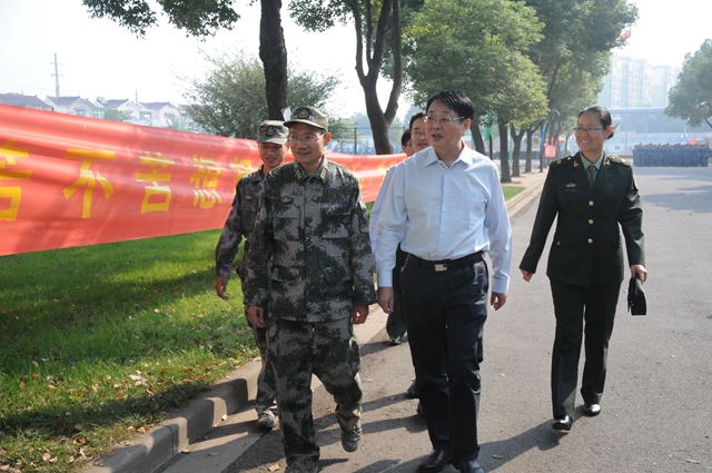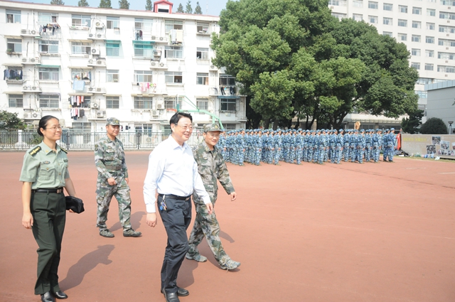 程建军一行在浦口校区看望了正在进行军训的所有教官和学生,对教官的悉心指导表示感谢,对参训学生的良好精神面貌表示肯定,勉励大家要刻苦努力,不畏困难,坚持到底,努力完成军训任务;在草场门校区,他们观看了队列训练和女子匕首操表演方阵的训练,对参训学生的表现予以充分肯定,对教官的辛勤付出表示由衷感谢,并对因伤无法参训的同学表示了慰问,叮嘱带队老师要关注学生的思想动态,对于军训中可能出现的问题做到早发现、早处理,特别是要照顾好因病无法正常参训的同学。