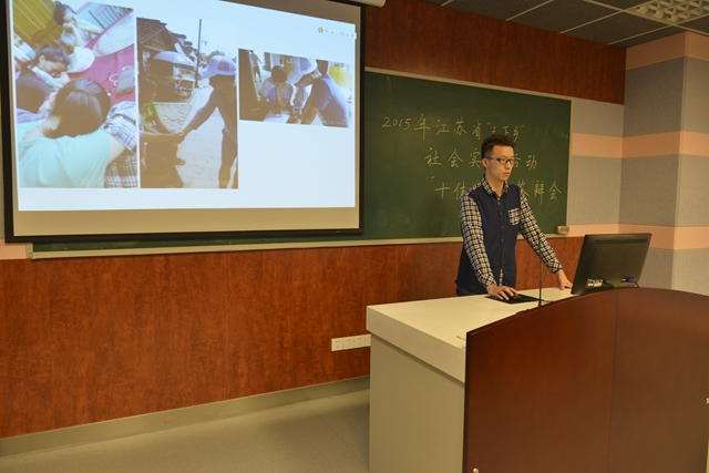 答辩会上,候选团队和个人通过ppt播放及视频等展示方式,从暑期社会实践团队的主题方案、活动开展、取得成效和社会反响等几个方面入手,将实践过程中的团队特色一一呈现,将青春励志的实践故事娓娓道来。南京大学“听见凉山”社会实践团走近偏远山区,投身社会建设,挥洒青年抱负;南京医科大学社会实践团致敬抗战老兵,重温抗战记忆,肩负青春使命;我院“盛夏中小黄人”实践团来到外来务工人员子女身边,开展义务支教,展现青春风尚……青年大学生在“践行八字真经、投身四个全面”旗帜的号召下,积极树立和践行社会主义核心价值观,更加坚定跟党走中国特色社会主义道路、为实现“四个全面”战略布局和中国梦努力奋斗的理想信念,努力为“迈上新台阶,建设新江苏”贡献青春正能量。