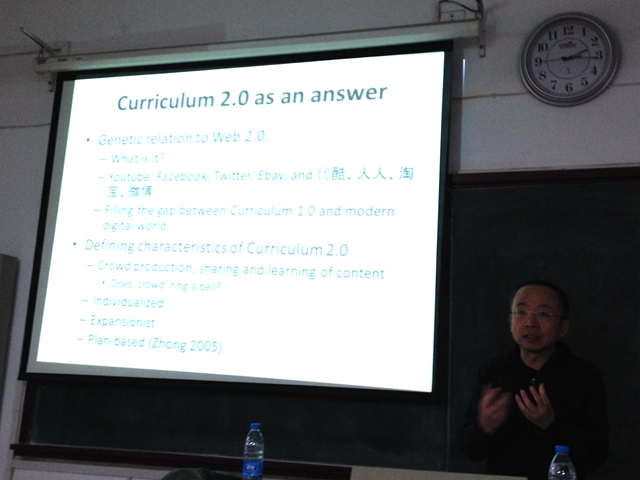 钟教授从当前课程存在的问题谈起,以互动交流的方式展示了其探索多年的新课程成果。该课程用“学教”、“学教方案”、“学材”、“作品”、“导学”、“学伴”等新术语构建了网络2.0环境中的教学新模态,其特点为众造、个性化、拓展性和方案评估。钟教授同时还以翻译课程为例展示了其实施课程2.0的导学过程和学生作品。
