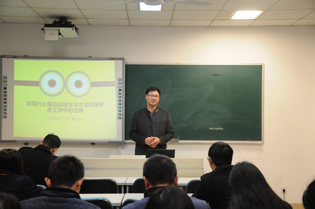 本期辅导员沙龙首次活动,邀请了南京师范大学心理健康咨询中心副主任曹加平副教授来校作了《后现代心理咨询理念与方法在辅导员工作中的应用》主题讲座。曹老师从辅导员们常见的工作困境谈起,指出辅导员工作容易出现的误区,引导辅导员们更好地把握与学生的会谈原则、会谈方向和会谈技巧。曹老师还就辅导员们提出的个案作了精彩的案例督导。活动中,辅导员们还结合前一阶段的学业预警工作,就辅导员在大学生学业指导中所做工作进行了交流。