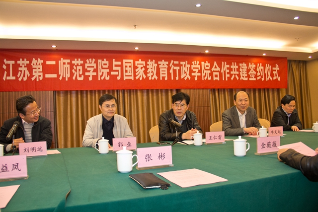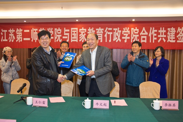 11月28日下午,国家教育行政学院与我校合作建立中国教育干部网络学院江苏分院签约仪式在我校举行,国家教育行政学院副院长、教育部中小学校长和幼儿园国家级培训项目管理办公室主任牛文起,江苏第二师范学院院长、江苏省教育科学研究院党委副书记、江苏教育行政干部培训中心主任王仁雷出席仪式。