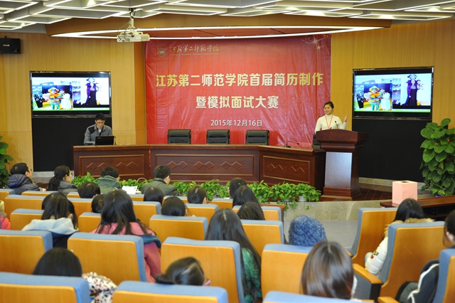 为帮助在校大学生提高简历制作水平,提升面试能力,12月16日下午,招就处在草场门校区举办江苏第二师范学院首届简历制作暨模拟面试大赛。大赛邀请江苏省高校招生就业指导服务中心招聘服务部部长蔡亮、孩子王集团有限公司人事部经理何叶萍、学工处处长刘莹、小行校区管委会副主任王建宏、人事处处长助理顾晔峰担任评委。