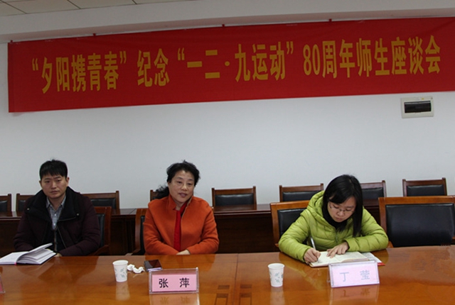 近日,我校在草场门校区举办“夕阳携青春”——纪念“一二•九运动”80周年师生座谈会,校关心下一代工作委会副主任张萍、团委副书记丁莹出席,团委吴迪老师及各校级组织负责人和国防社成员代表参加会议。