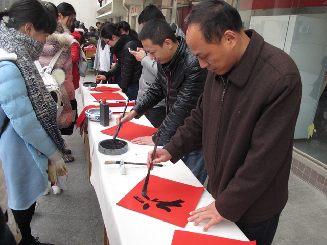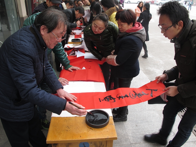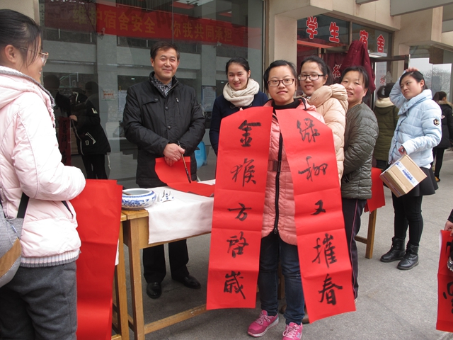 为弘扬中国传统文化,培育和践行社会主义核心价值观,发挥校园文化在传承文化上的育人功能,1月5日中午,校团委联合关心下一代工作委员会,在草场门校区举办“夕阳携青春,春联送祝福”活动。参加此次活动的有关工委袁永椿老师和周傲齐老师。正院级调研员胡相峰、学报编辑部主任庞爱中、生命科学与化学化工学院老师孙奕和美术学院老师张迪等应邀倾情加盟,活动还邀请了校外书法界人士张亮前来交流。离退休工作处、学工处、招就处、教师教学发展中心、团委等职能部门的负责人参加活动。