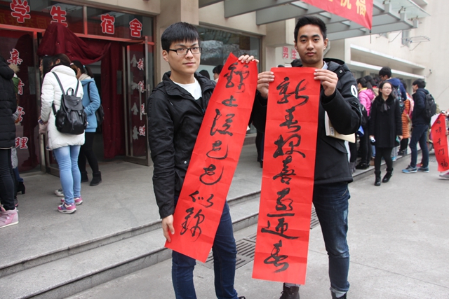 活动在树人斋楼下举行。书法家们精湛的技艺引来了一波又一波前来围观的同学,他们一边忙着选对联,一边紧紧地盯着“即将新鲜出炉”的春联,生怕“宝贝”被人抢走。书法家们有的自由发挥,有的则是应大家要求“量身订制”,一幅幅火红的春联将现场映衬得分外喜庆,看到师生们如此热情,书法家们分签蘸墨更加起劲。
