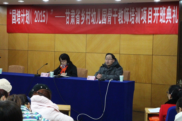 1月5日上午,我校在草场门校区现代教育技术楼一楼报告厅举行“国培计划(2015)”—甘肃省乡村幼儿园骨干教师培训项目开班典礼。继续教育办公室主任章飞、学前教育学院副院长徐群出席典礼,活动由章飞主持。