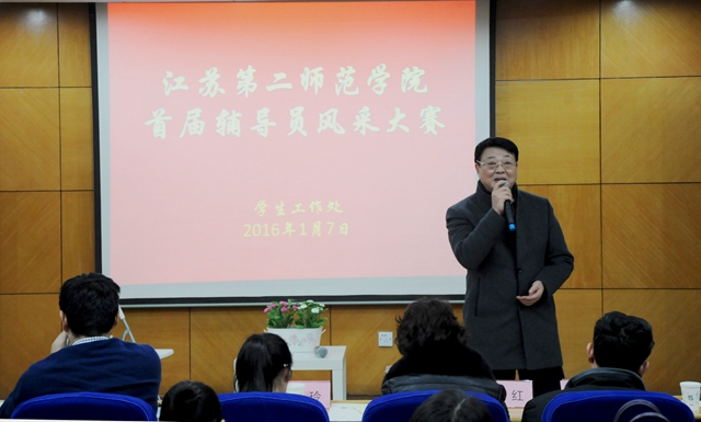 1月7日下午,我校首届辅导员风采大赛第二场比赛暨颁奖典礼在草场门校区举行。党委副书记、副院长程建军出席活动并发表讲话。南京师范大学心理学院党委书记周红、南京特殊教育师范学院学工处副处长王玲及我校党委宣传部部长王宵前、招生就业处处长刘贵友担任本场比赛评委。
