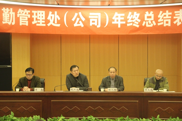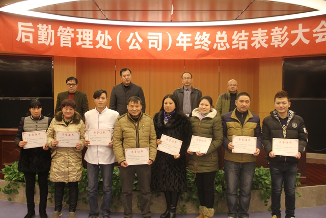 后勤管理处处长胡元强首先作后勤处和教苑公司年度工作总结。他总结了全年后勤各部门在服务师生员工、维护稳定和节支创效等方面取得的成绩,并指出了存在的问题和不足,要求各部门加强安全管理和制度建设,来年取得更大成绩。副处长黄大双宣读2015年度后勤处和教苑后勤公司表彰决定,获奖单位和个人代表分别发言。与会领导共同为先进单位和优秀员工颁发获奖证书并合影留念。