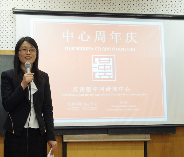 “汉语暨中国研究中心”中方主任翟洪云致辞,她对中心一年来取得的成绩进行了回顾,对莫州大校长和友好人士表示衷心感谢。莫州大语言系主任伊琳娜·别里亚耶娃发表讲话,对中心一年来的工作表示肯定,对今后的工作提出希望。她说,“汉语暨中国研究中心的成立,给莫州大学习汉语的学生提供了交流的平台和了解中国的窗口,开展的活动有显著的中国特色,受到俄罗斯大学生的欢迎”。