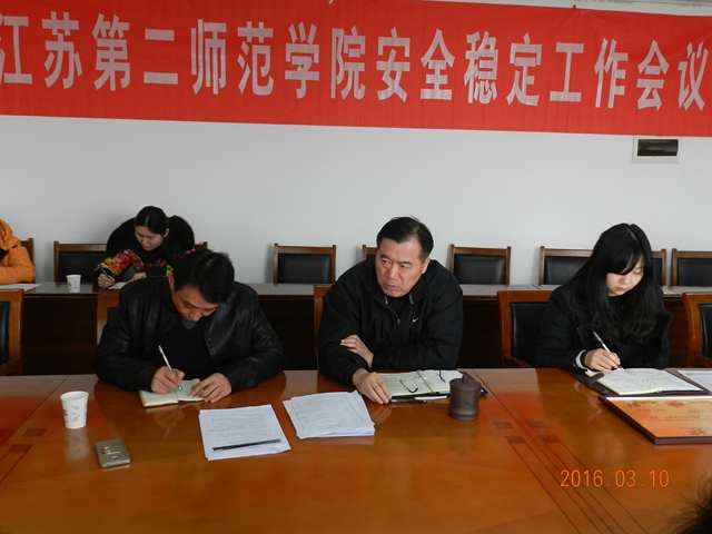 3月10日下午,我校在草场门校区教科研楼503召开安全工作专题会议。副院长祝兴成出席会议并讲话。各二级学院党总支书记以及学工处、团委、教务处、后勤管理处、资产管理处、浦口校区管委会、小行校区管委会、保卫处等职能部门负责人参加会议。