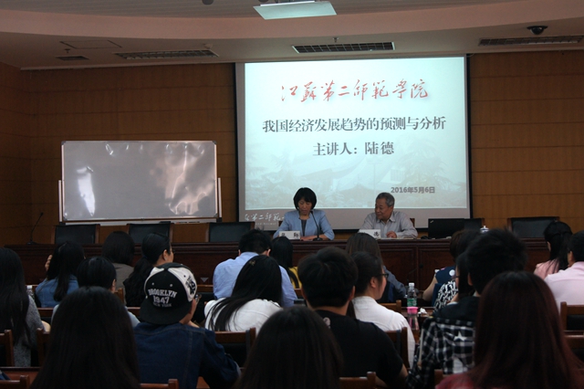 5月6日上午,科研处在草场门校区举办高端学术讲座,邀请著名学者、北京大学中国区域经济研究中心研究员、亚洲知识管理协会院士陆德教授来我校,举行题为“我国经济发展趋势的预测与分析”的讲座。副院长张勤主持会议,科研处、学工处、马克思主义学院、分院管理办公室等部门负责人以及各二级学院辅导员、马院教师及经济与法政学院师生近百人参加会议。
