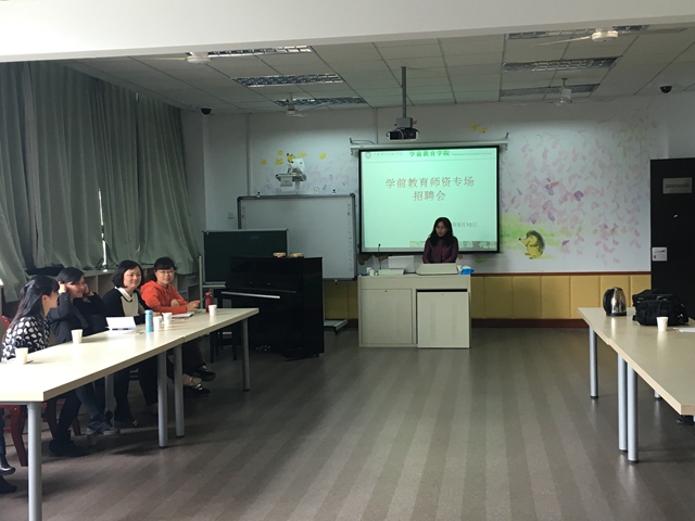 5月10日下午,学前教育学院在小行校区实验楼216教室举办学前教育师资专场招聘会。江苏省省级机关实验幼儿园,南京实验幼儿园科睿分园、金地自在城分园,南京市第一幼儿园以及栖霞第一实验幼儿园等多家幼儿园来院招聘,我院数十名毕业生参会。