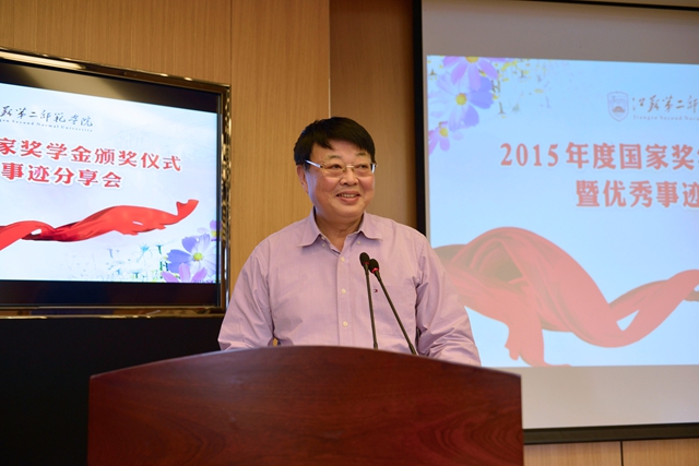 程建军宣读国家奖学金获奖名单并讲话。他首先对获得国家奖学金的优秀同学表示祝贺,同时对培养这些同学而付出努力的各位老师们表示深深的感谢。他用习近平总书记的话来勉励同学们,青春不是用来挥霍的,是用来奋斗的;不是用来虚度的,是用来干一份事业的。广大青年学生在大学里首要任务是肩负起未来祖国的重任,为中国梦的实现去书写自己的人生篇章。他指出,如何有价值、有作为、有成就感地过好大学生活,是每一个大学生面临的重要课题。任何一名大学生将来适应社会不仅要有坚实的知识基础,更需要有宽广的人文胸怀。他希望国家奖学金获得者为广大同学树立好的榜样,希望二师院在未来的发展过程中有更多优秀的同学脱颖而出,不仅在自己的人生道路上取得重要的成就,也为母校、为祖国作出更大的贡献。