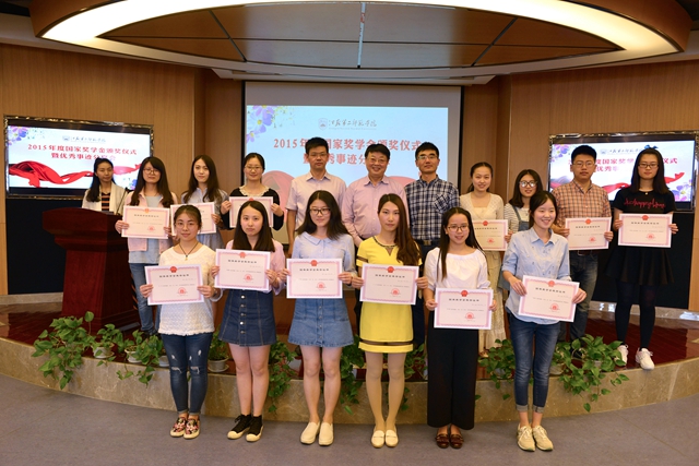 与会领导为13位获得2015年度国家奖学金的优秀学生颁发了荣誉证书。