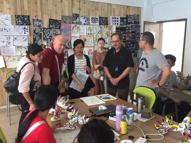 课间,教授们和学生展开了互动交流,观摩了学生的课堂和作品制作过程,并提出了想法和建议。中西思维火花的碰撞给同学们带来了崭新的视野,大家表示收获颇多。