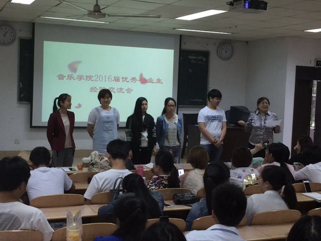 6月12日下午,音乐学院举行2016届优秀毕业生经验交流会。该院党总支书记蒋向红出席并讲话,五位2016届优秀毕业生在会上进行经验交流。
