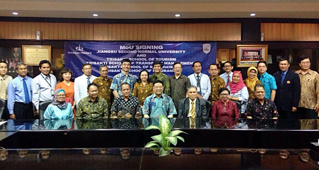 印度尼西亚特里莎蒂基金会旗下有5所高校,涉及旅游,经济管理,运输,保险,传媒等领域,共有约12000名学生。李洪天向对方代表介绍了我校的办学历史、办学条件、办学特色等情况,并代表我校与特里莎蒂旅游学院、经济管理学院、运输管理学院、保险学院、传媒学院签署合作备忘录。