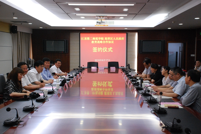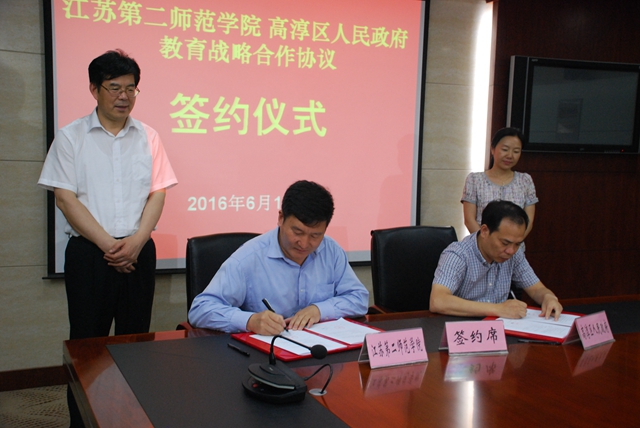 6月17日下午,我校与高淳区人民政府教育战略合作协议签署仪式在高淳区人民政府会议室举行。院长王仁雷、副院长潘文,高淳区区委副书记徐莉莉、副区长袁建华等出席签约仪式。高淳区教育局局长张培成主持签约仪式。