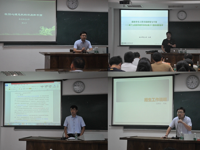 南京师范大学心理健康教育与咨询中心主任曹加平应邀作了《校园心理危机的识别和干预》的专题讲座,介绍了相关工作流程和处理危机事件的宝贵经验,对危机干预的各个阶段作了具体有效的指导。南京师范大学新闻与传播学院党委副书记沈菲应邀作了《高校学生工作方法的变与不变——基于全国高校辅导员职业能力大赛的观察思考》的专题讲座,结合辅导员职业能力大赛及日常管理工作,对网络思想政治教育、数据分析生产两大变革,以及针对学生个体的现实交流方面、针对班级全体的教育引领两大不变,进行了阐释。南京科技职业学院学工处副处长张威应邀作了《学生公寓教育管理工作》的专题讲座,就该校学生公寓管理的变迁、管理结构、工作职能等方面进行了经验分享。