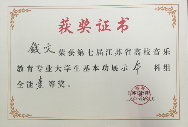 在8月29日结束的江苏省高校音乐教育专业大学生基本功(五项全能)比赛中,我校三名参赛同学经过钢琴演奏、歌唱与伴奏、自弹自唱、乐器演奏、指挥等项目的全面角逐,最终获得本科组团体二等奖(全省15所参赛本科院校中排名第四)。另外,三人在个人单项中都有斩获,钱文同学获得个人全能一等奖,器乐演奏单项奖第一名,自弹自唱单项奖第三名;钱家莹同学获得个人全能二等奖,钢琴演奏单项奖第十名;郭雯昕同学获得自弹自唱单项奖第五名。