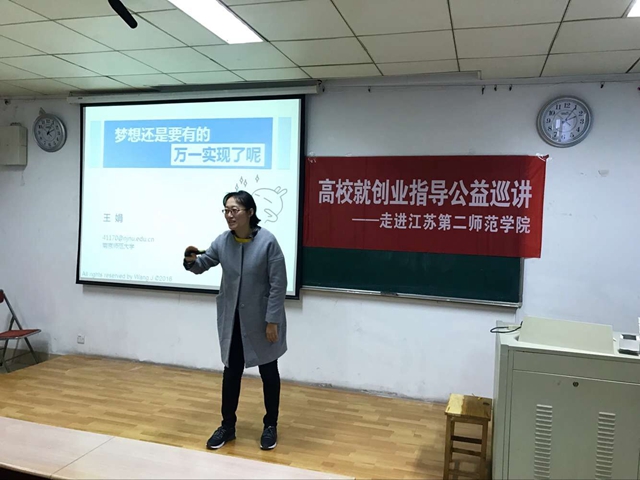 11月2日下午,由江苏省招就中心主办、我校招就处承办的“江苏省高校就创业指导公益巡讲——走进江苏第二师范学院”活动在草场门校区举行。讲座由招就处副处长杨嵘主持,南京师范大学王娟老师受邀担任主讲嘉宾。